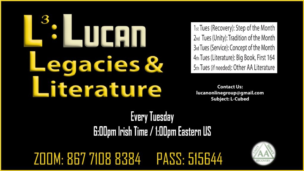 L-Cubed is an Ireland-based AA Legacies & Literature Study Group gathering on the Zoom platform. We hold one open meeting weekly. A WhatsApp network provides a place for questions and discussion between meetings.